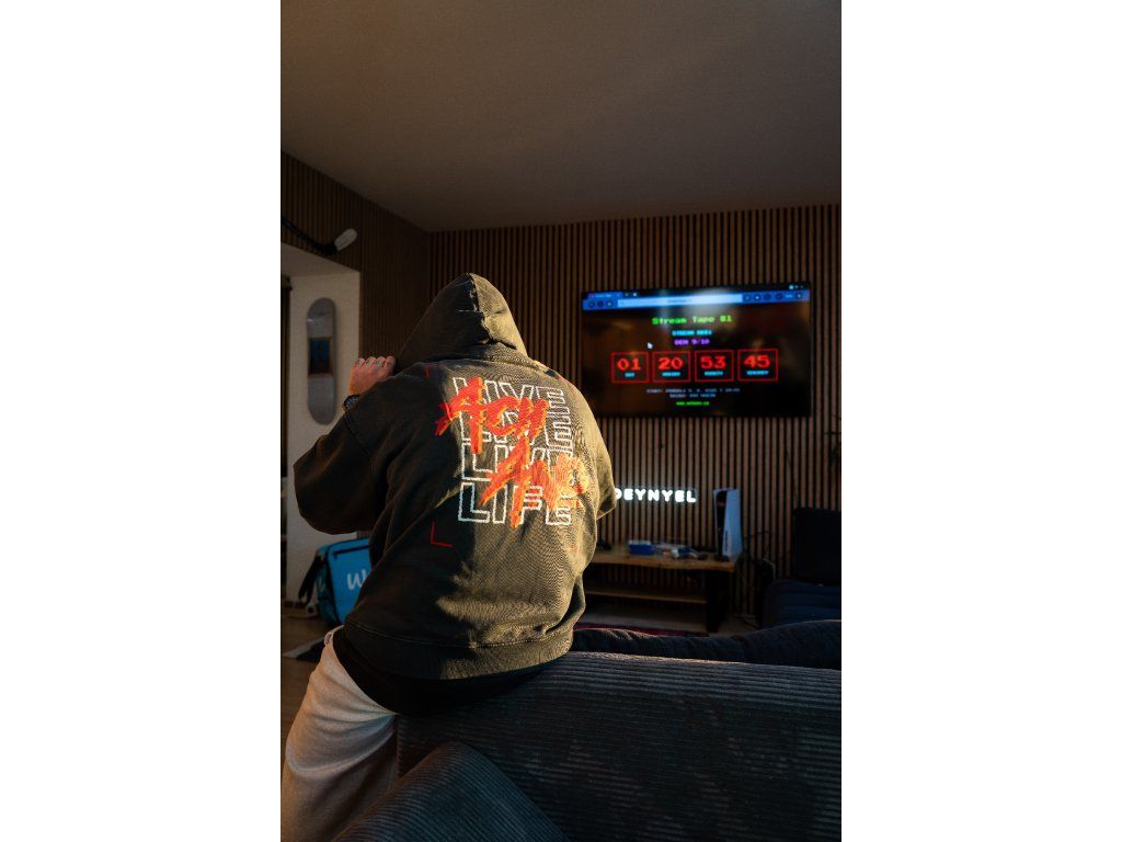 Perte na 30 stupňů a sušte odděleně, barva může pouštět. Nežehlete přes potisk. Perte a žehlete naruby. Jedná se o oděv barvený jako hotový výrobek, každý kus se může vzhledově lišit. Vyšisovaný efekt se bude časem zvýrazňovat. Barva se může třením přenášet na světlé materiály.